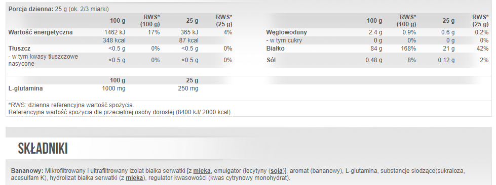 Whey Protein Isolate - whey protein isolate is characterized by an exemplary content of the most important amino acids with anabolic effect and active micro-peptides. The use of a unique production technology allows for a record-high protein concentration and the highest degree of purity. As a result, this protein is practically completely free from undesirable components that could reduce its nutritional value. The supplement contributes to the growth and maintenance of muscle mass.