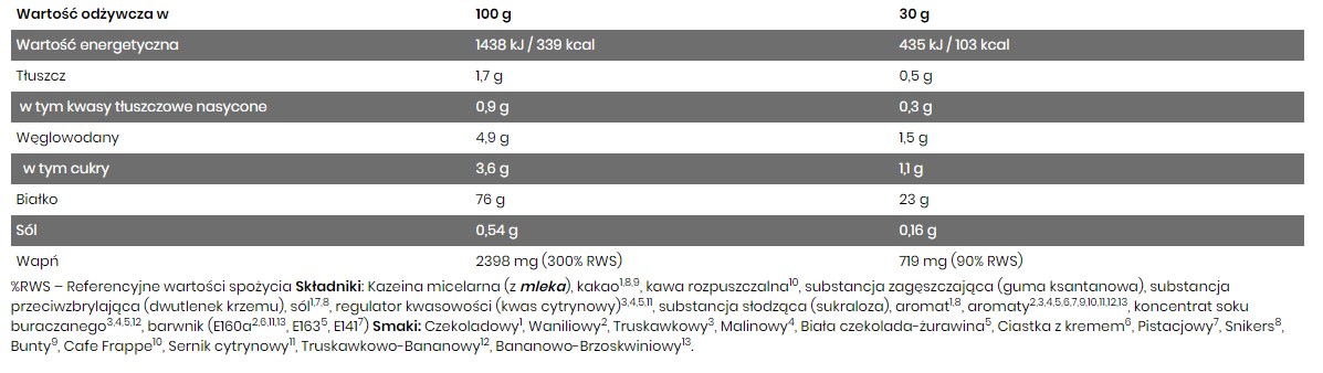 The supplement ensures a multi-hour supply of all essential amino acids to the muscles, including large amounts of BCAAs and L-glutamine. Pure casein rich in a high dose of L-leucine compared to other protein sources (e.g. soy protein, chicken or beef). Intense stimulation of muscle protein synthesis perfectly promotes growth and regeneration of muscle tissue.