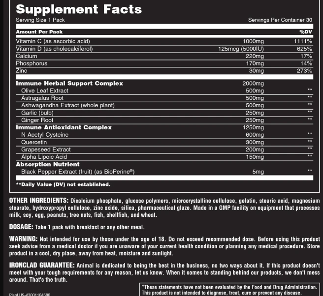 Animal Pak Immune Support by Universal is a new immune booster designed for athletes. A combination of the most effective ingredients that stimulate the immune system to work properly. The package contains 30 sachets. The supplement is an excellent support for the body of physically active people. A high dose of the most important vitamins for health: C and D, as well as a set of ingredients with antioxidant effect. Minerals such as calcium, phosphorus and zinc influence healthy bones and strengthen the body, protecting against infections. Advanced immune booster is a set of natural plant and herbal ingredients.