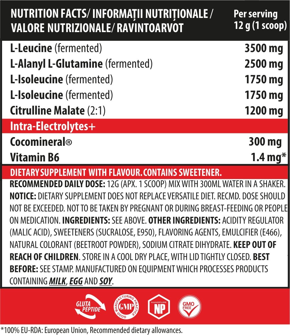 Genius Nutrition BCAA X5 high-quality BCAA amino acids. The supplement has a positive effect on the body's performance during exercise and allows for an increase in protein synthesis. BCAA amino acids effectively prevent the breakdown of muscle proteins and reduce damage caused by intense physical exercise. Use allows you to achieve the desired body composition with low fat content and maintaining muscle mass. The patented formula contains 100% fermented BCAA amino acids with the addition of CocoMineral® electrolytes, Citrulline, Vitamin B6 and Glutamine.