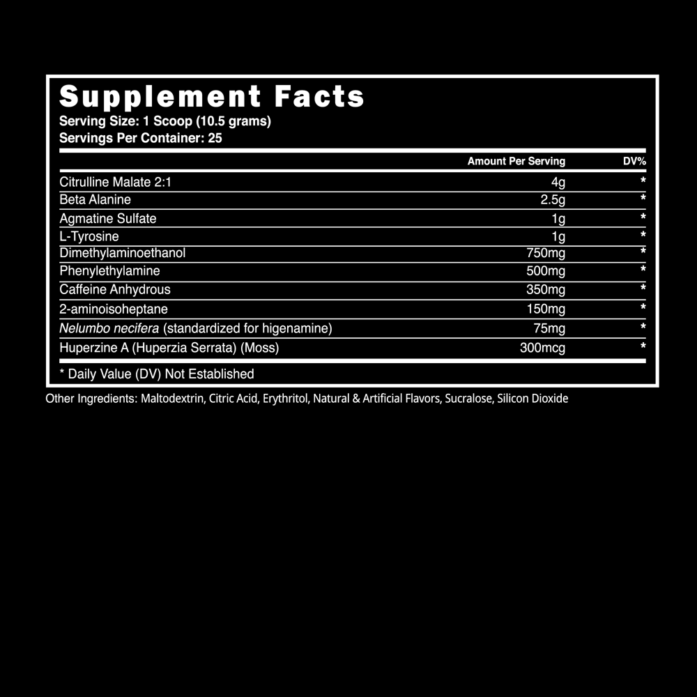 Dimethylaminoethanol (750 mg) increases brain power, improves memory and increases concentration by increasing the production of acetylcholine. Higher levels of acetylcholine increases the level of focus and muscle strength during intense exercise.