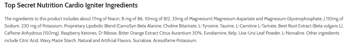 Top Secret Nutrition Cardio Igniter pre-workout composition: