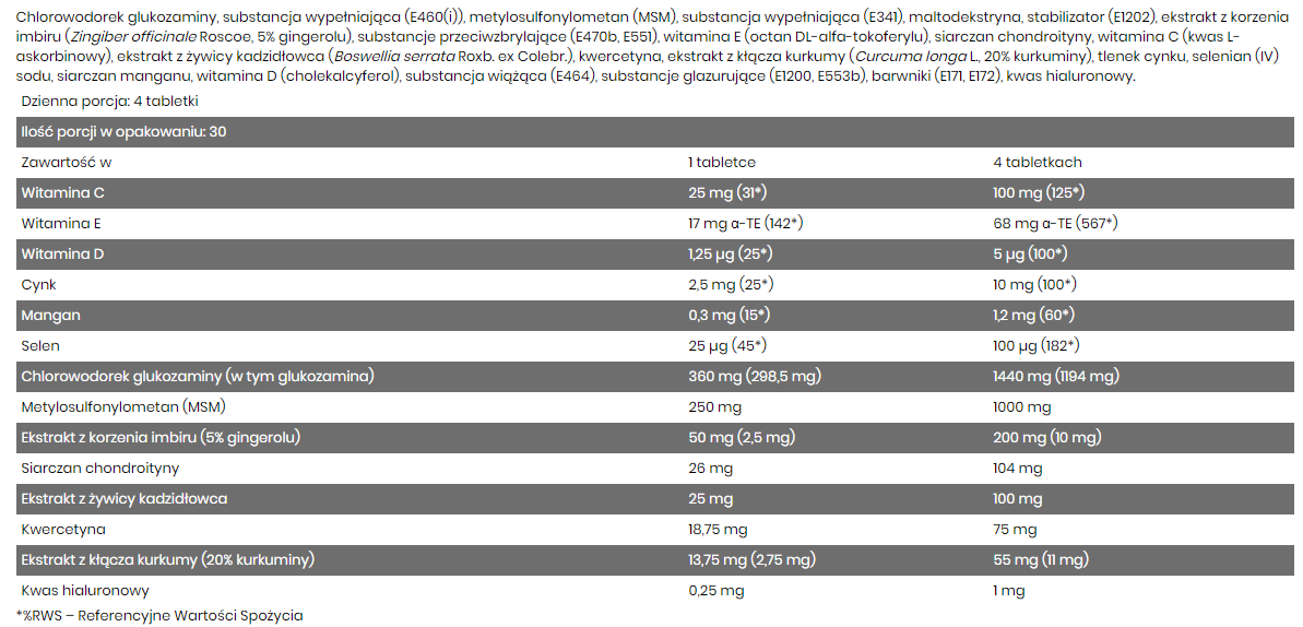 MSM - is a natural sulfur compound easily absorbed by the human body, which is important for the proper regeneration of joints. In combination with other components of the complex, it provides adequate flexibility, strengthens the structure of tendons, muscles and ligaments, participates in collagen synthesis. It also has a strong analgesic effect and improves the permeability of cell walls, thanks to which toxic or unnecessary substances (e.g. lactic acid formed during exercise) can be removed even faster.