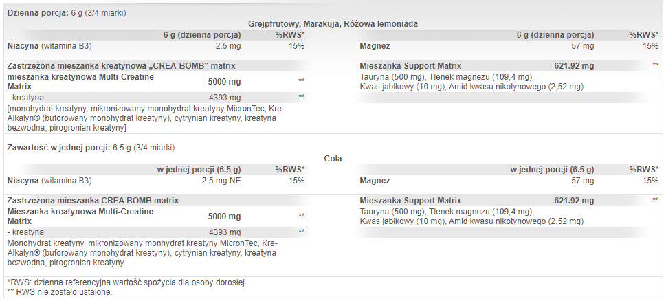 The supplement is recommended for athletes who want to increase physical performance. Perfect for use during short and intense physical exercises. Crea Bomb has a great influence on obtaining lean muscle mass, intensifies the muscle pump and has a positive effect on post-workout regeneration. The high anabolic potential of the ingredients allows for a rapid increase in muscle mass without excessive water retention.