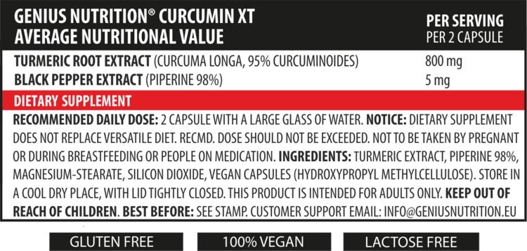 Genius Nutrition Curcumin XT is a high-quality supplement containing turmeric rhizome extract (Curcuma longa L.), standardized to contain 95% curcuminoids and plenty of black pepper extract. 1 serving contains 800 mg of turmeric extract.