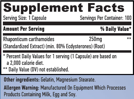 Rhaponticum carthamoides - 250 mg - is a plant rich in ecdysteroids active compounds with strong anabolic potential. In sports supplementation, ecdysterone is used to improve insulin sensitivity as well as to support muscle mass building. The supplement perfectly stimulates anabolic hormone levels, which translates into improved sports performance.