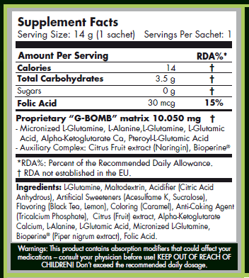G Bomb is a multi-component, advanced supplement that provides various forms of glutamy. Glutamine is transformed through glutamate into AAKG alpha-ketoglutarate, which is an integral component of the Krebs cycle and is involved in the production of energy in the body. The supplement intended for athletes contributes to the reduction of tiredness and fatigue, is responsible for the proper synthesis of amino acids, intensifies the feeling of a muscle pump, improves blood flow, thanks to which it naturally increases sexual performance.