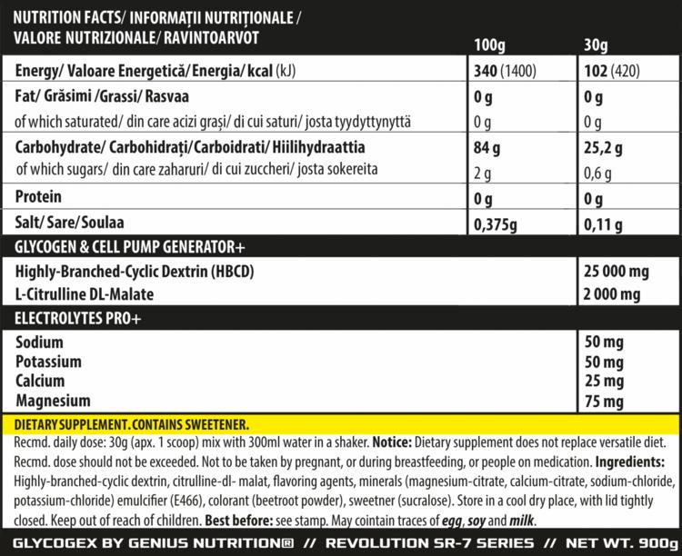 Genius Nutrition Glycogex is a new carbohydrate preparation based on high-quality branched cyclic dextrin (HBCD), citrulline malate and electrolytes. The formula provides the body with the necessary ingredients during and after intense training. The supplement ensures increased training efficiency, intensifies the feeling of muscle pump and replenishes glycogen deficiencies. Electrolytes such as sodium and potassium support the proper functioning of nerves and muscles. They are particularly helpful, especially during intense training.