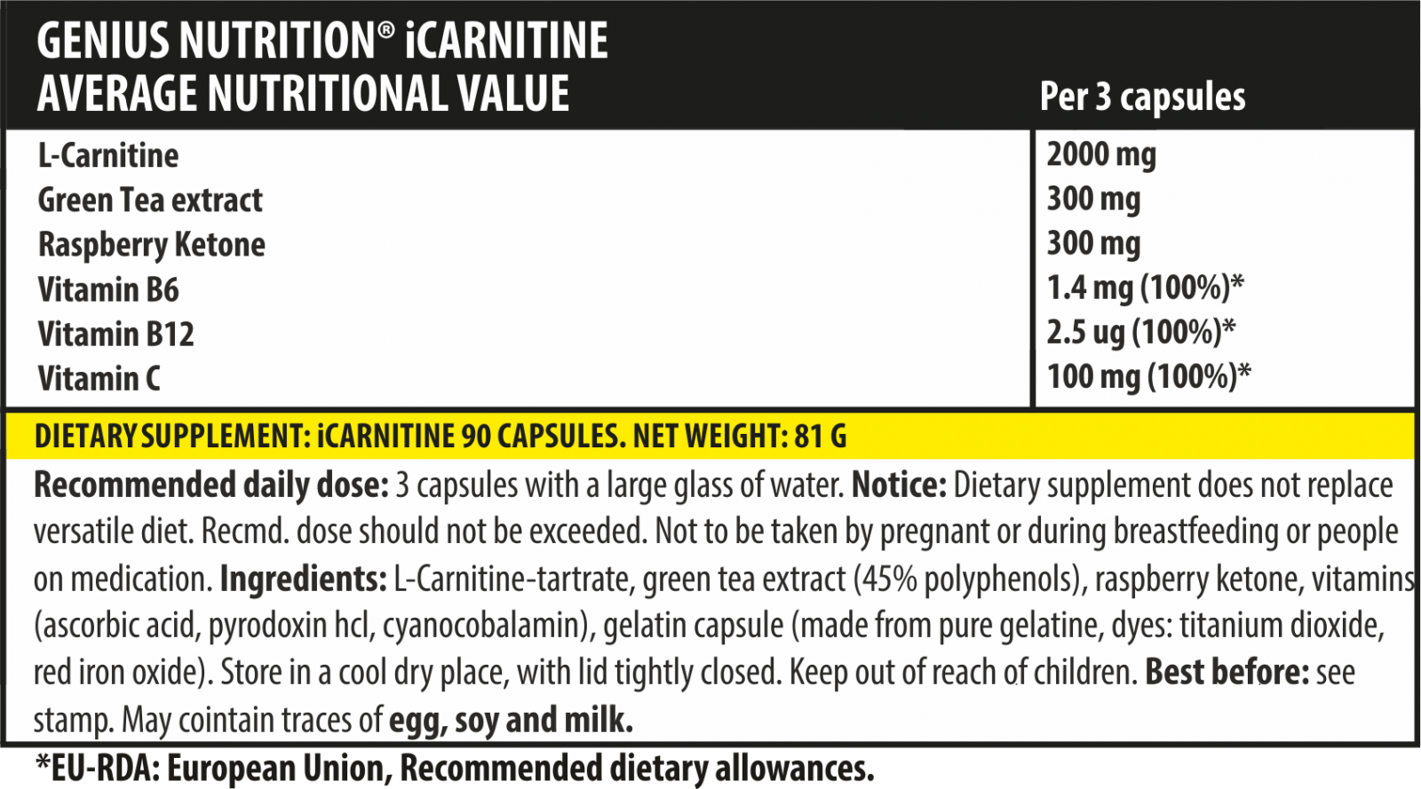 Genius Nutrition iCarnitine is a new formula of l-carnitine (a combination of l-carnitine and l-tartrate into one molecule). iCarnitine is a strong fat burner that affects the transport of fats to cells, which are later used in the body for energy. The iCarnitine supplement increases metabolism, contributes to faster ammonia removal and provides increased protection of the immune system. The active ingredients of iCarnitine include the amino acid L-carnitine, raspberry ketones and green tea extract.