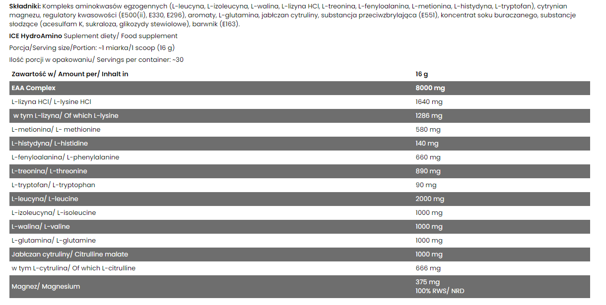 Ice Hydro Amino Fitness Authority a new supplement rich in amino acids containing, among others exogenous amino acids (EAA), branched chain amino acids (BCAA), L-glutamine and citrulline The preparation is intended for physically active people. Supplement developed with a special cooling effect EVERCOOL, which provides a feeling of cooling and refreshment during intense workouts. The addition of magnesium effectively reduces the feeling of fatigue and affects the proper energy metabolism.