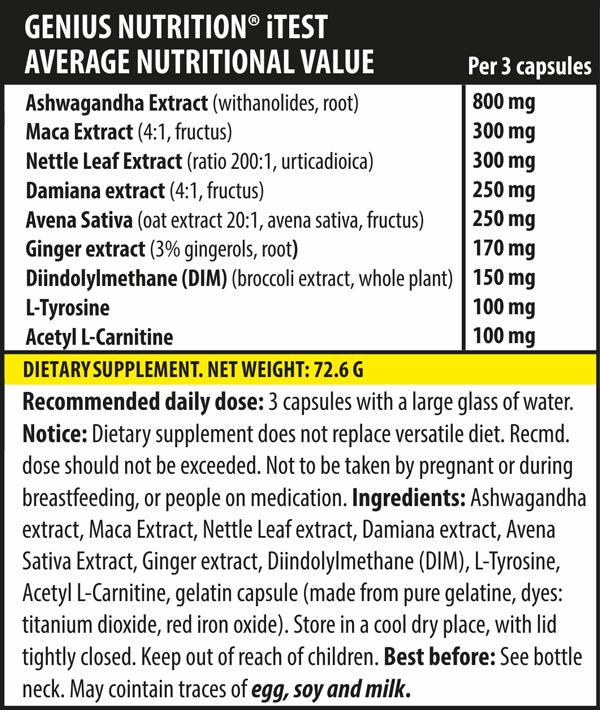 Genius Nutrition iTest contains a set of the strongest ingredients designed to increase testosterone levels while reducing estrogen activity. The preparation perfectly improves libido and affects anabolism. The preparation supports the burning of fat tissue while improving the development of muscle tissue. Innovative ingredients: Ashwagandha extract, Maca extract, nettle extract, Damiana leaf extract, DIM, Acetyl L-Carnitine effectively support all processes that stimulate the natural production of testosterone, while reducing estrogen and cortisol levels.