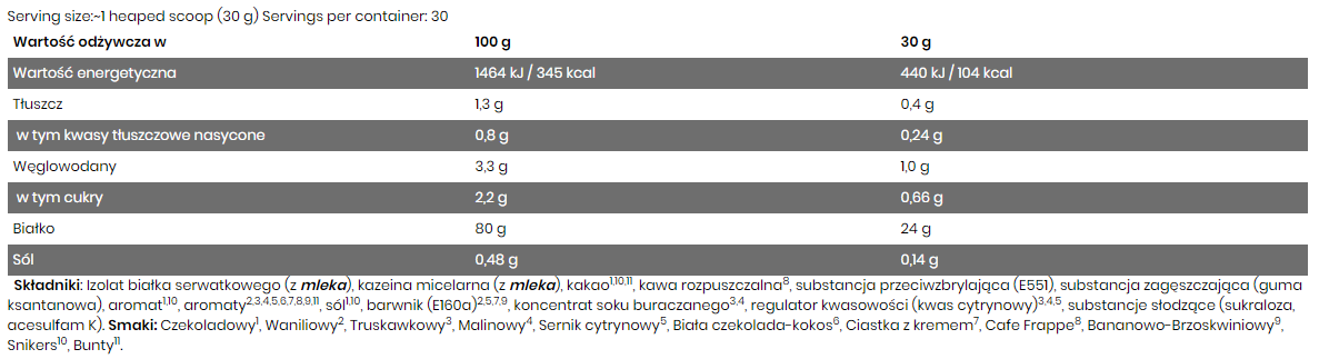 The protein isolate has a short digestion time (about 90 minutes), and quickly replenishes amino acids by transferring them into the bloodstream. WPI is a type of protein that is perfect for when we need fast protein delivery, e.g. during training time. Casein is also a source of high content of exogenous amino acids and BCAA. Micellar casein is the purest and best form of casein protein. It has a strong anti-catabolic effect, has a slow digestion process of up to 8 hours. The combination of two sources of protein slowly and quickly absorbed ensures a constant supply of amino acids, influencing the growth of muscle mass.