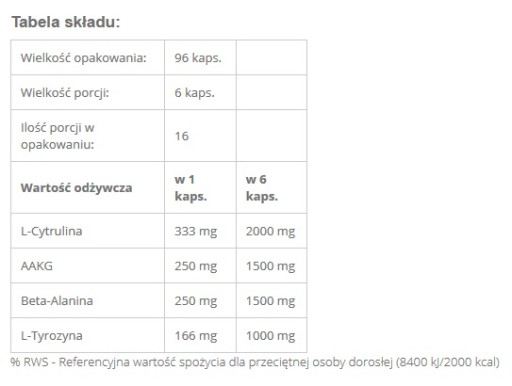 L-Cytruline - participates in the synthesis of nitric oxide (NO) and phosphocreatine and oxygen glucose metabolism, thereby increasing the uptake of oxygen, glucose, amino acids and creatine and energy production through muscle cells. It reduces the concentration of lactic acid and ammonia in the muscles, thanks to which it allows the body to recover energy faster by increasing the level of creatine phosphate and ATP resynthesis.