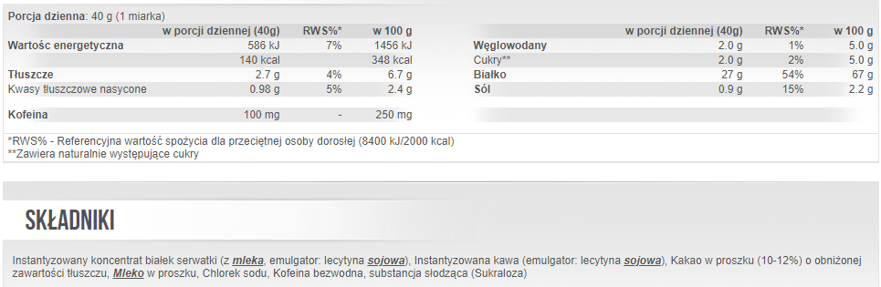 100 mg of caffeine per serving and 27 g of protein is the perfect drink to start the day or as a pre-workout shake. Protein Coffee is recommended to be used with warm milk or water. It contains high-quality coffee with no added sugar. The WPC whey proteins contained in the product constitute a complete set of all amino acids necessary for muscle growth and development. Protein supplement