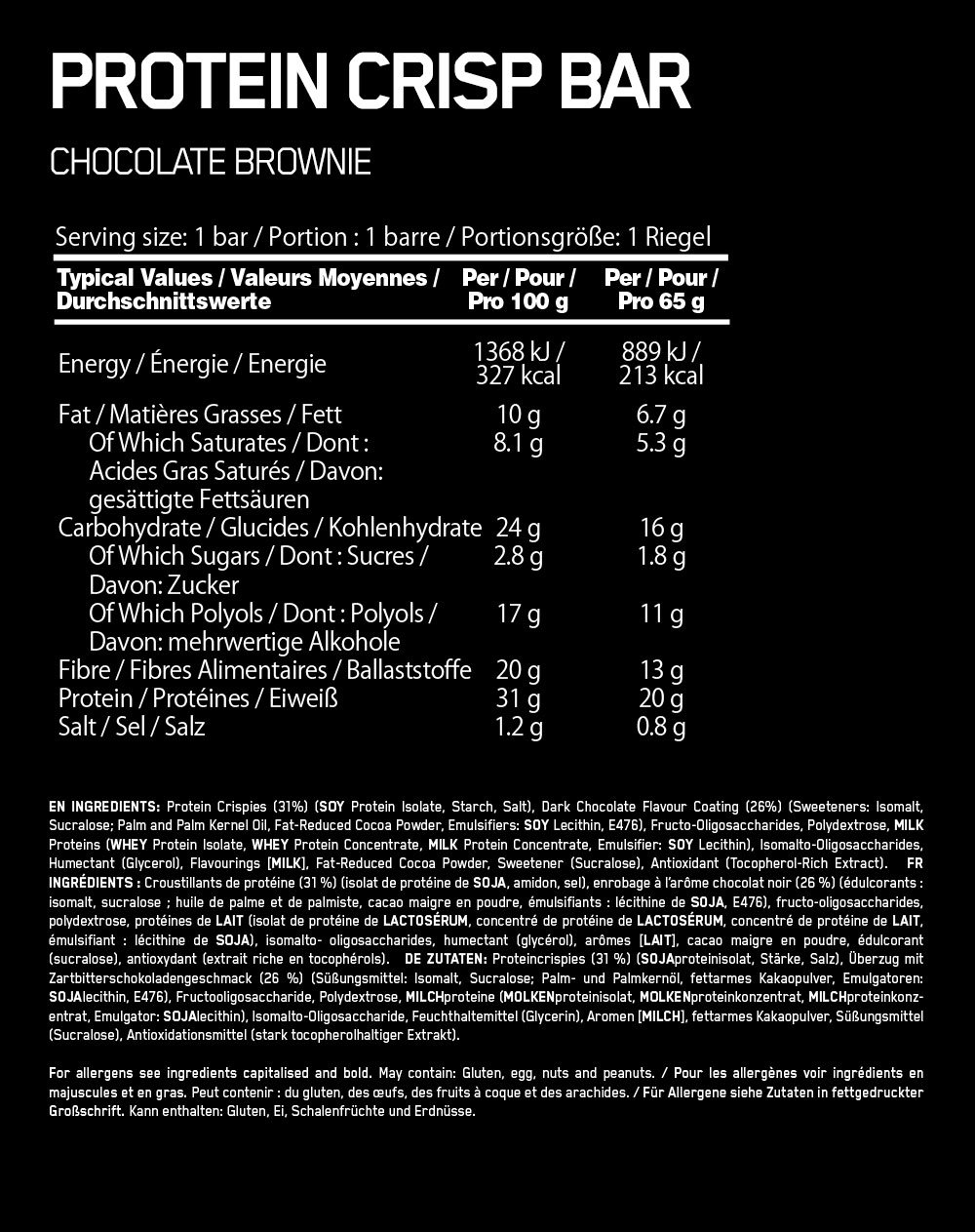 Protein Crisp Bar protein bars with an extra crunchy texture. Each bar contains 20 g of protein, with no added sugar. The bulk package contains 10 bars. The crunchy exterior with a creamy filling provides an amazing taste experience. The bar is a healthy snack with low calories. It allows you to quickly provide the necessary nutrients after an intense workout. High quality protein snack rich in high protein content available in two flavors: Chocolate, Peanut Butter.