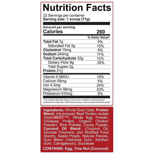 Real Carbs & Protein 5% Nutrition high-quality blend of proteins and carbohydrates, intended for athletes, supporting the construction of lean muscle mass. The supplement promotes the maintenance of the anabolic environment and affects the regeneration of the body. The innovative HydroBeef beef protein hydrolyzate, egg powder, chickpea protein and organic chicken powder create an extraordinary protein blend with different absorption rates. This is one of the best meal substitutes with such a rich composition. The product contains as much as 20 g of protein and 30 g of carbohydrates per serving and is a complete meal replacement for physically active people, enriched with magnesium, potassium, vitamin A and iron.