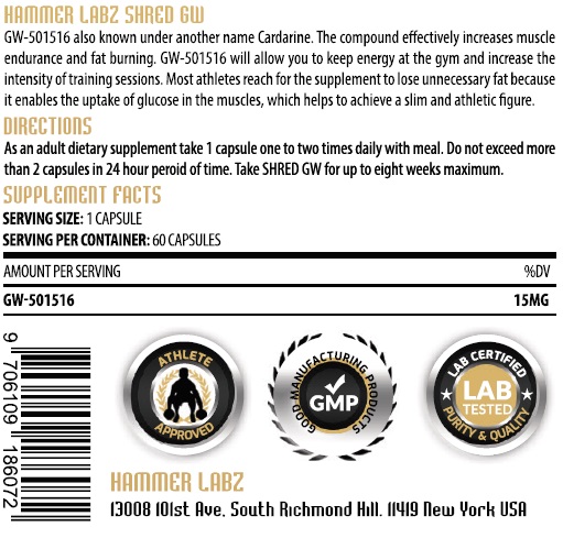 Hammer Labz Shred GW contains the sarm GW-501516, also known as Cardarine.