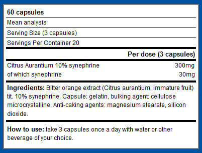 Synecaps Yamamoto Nutrition contains bitter orange extract standardized for 10% synephrine. 1 capsule contains 30 mg of active substance. Synephrine stimulates the nervous system in a similar way to adrenaline, tyramine or ephedrine. Affects the beta-3 receptor, which causes lipolysis. Synephrine has a similar structure to ephedrine, which is why it is considered as its natural substitute. Is obtained naturally from unripe citrus fruits, e.g. Citrus uranium L., Citrus aurantium L.