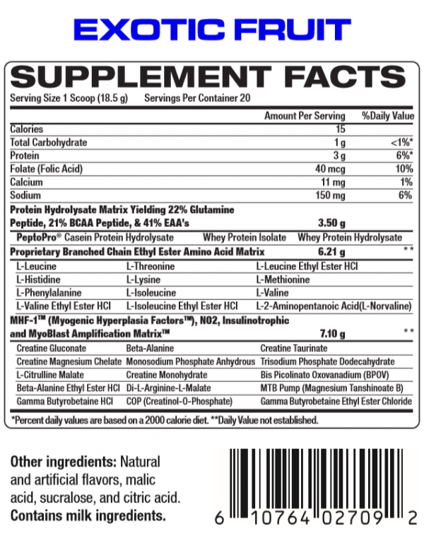 MHF-1, NO2, Insullinotrophic and MyoBlast Amplification Matrix - ingredients that strengthen the muscle pump, replenish glycogen and inhibit the breakdown of muscle mass.