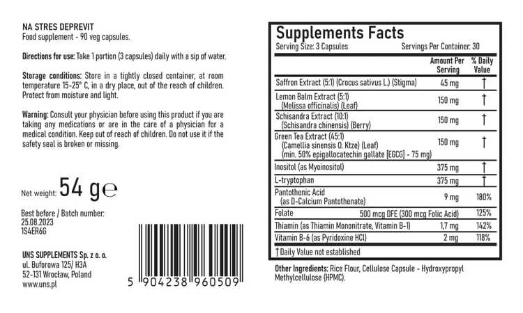 UNS Na Stres Deprevit 90 caps is a supplement recommended for people struggling with depressive disorders, lowered mood, anxiety or lowered self-esteem. It supports the proper functioning of muscles, the functioning of the nervous system and the maintenance of proper psychological functions. Deprevit is great as an aid in the fight against insomnia. Recommended in the period of excessive exposure to stressful factors. The supplement increases motivation and increases alertness and attention. It naturally stabilizes the mood and emotions, increasing the energy balance of neurons.
