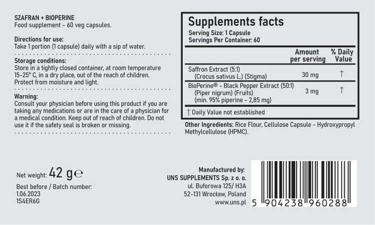 UNS Saffron perfectly increases the level of serotonin and dopamine, the so-called happiness hormones, the presence of which in the body has a positive effect on the well-being and mood of a person. Saffron has a number of medical properties. It has a positive effect on relieving the symptoms of premenstrual tension. It has anti-cancer and antibacterial properties. It was used in the treatment of many ailments: respiratory tract infections, asthma, cardiovascular diseases, heart and stomach diseases and arthritis. Currently, scientific research confirms its remarkable anti-cancer properties. Saffron is effective in the treatment of wounds, inhibits the growth of free radicals, which has a rejuvenating effect on the body.