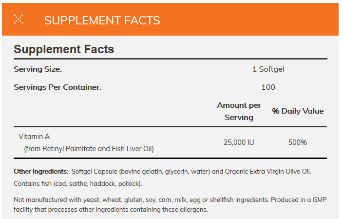 Vitamin A 25,000 IU Now Foods vitamin A in gel capsules. Contains ingredients derived from fish (cod, saithe, haddock, pollack). Containing vitamin A in the form of the body's most bioavailable retinol extracted from fish liver oil at a dose of 25,000 IU per capsule. Vitamin A is a group of organic chemical compounds in the fat-soluble retinoid group. Also known as retinol, beta-carotene, axerophthol and provitamin. A Are essential for maintaining the body's full health and should therefore be supplied with food. The recommended daily intake for an adult ranges from 700 to 900 uq. Severe deficiency leads to problems with vision skin and the digestive system.