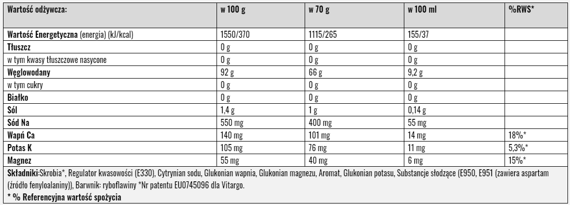 Vitargo Electrolyte 2000g Vitargo with electrolytes is a patented starch-derived carbohydrate with no added sugar and electrolytes. Supplement rich in complex carbohydrates with low osmolality. Vitargo® Electrolyte is a supplement that replenishes glycogen deficiencies in the body and provides electrolytes lost during intense training. Vitargo Electrolyte, compared to other carbohydrate supplements, does not increase the risk of weight gain because it does not cause fat accumulation. By providing a feeling of satiety, it minimizes the desire to snack between meals. The appropriate electrolyte balance is due to the addition of potassium and sodium in highly absorbable forms.