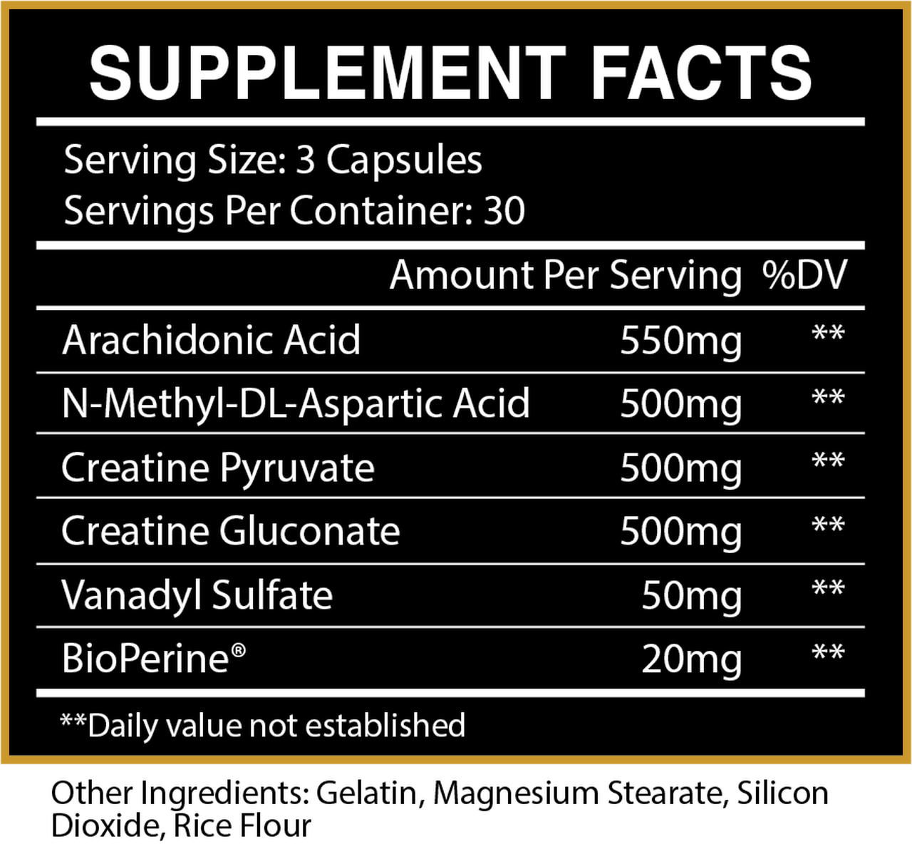 Arachidonic Acid - arachidonic acid is a compound that in our body increases the production of Prostaglandins, responsible for the process of increasing muscle mass and burning fat tissue. In addition, Arachidonic Acid increases the number of androgenic receptors and increases the level of IGF-1.
