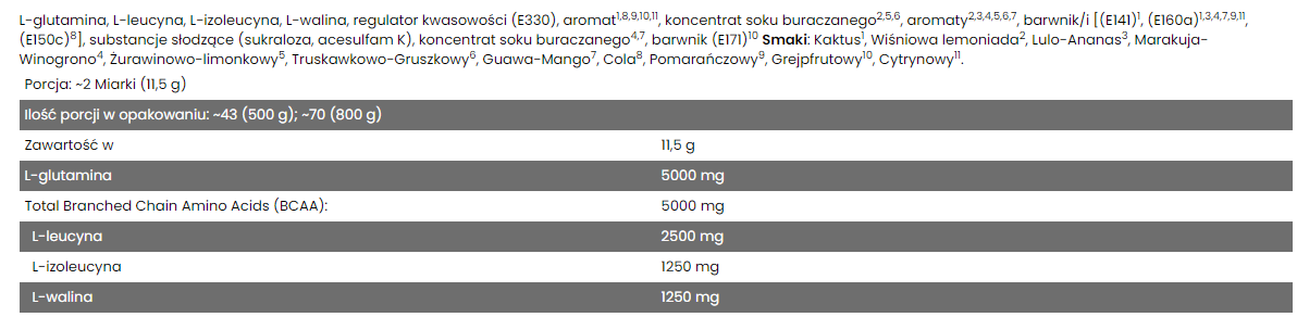 L-Valine - its presence in this combination, owes not only to the aforementioned need to administer all three BCAA amino acids together, but also to reducing central nervous system fatigue. In addition, as in the case of the other two amino acids, it is easily converted into energy used by working muscles and thus allows you to save the glycogen stores stored in the liver.