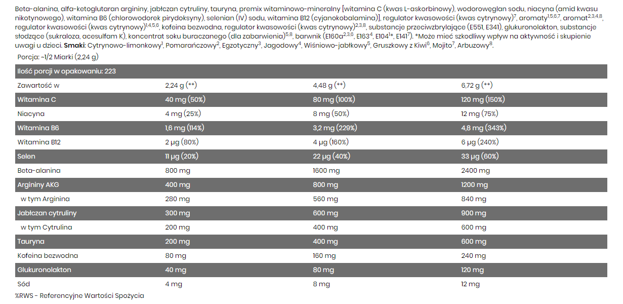 Anhydrous Caffeine - causes blocking of adenosine receptors in the brain which results in eliminating the feeling of tiredness during training. Due to its thermogenic effect, it effectively burns fat and improves metabolism.
